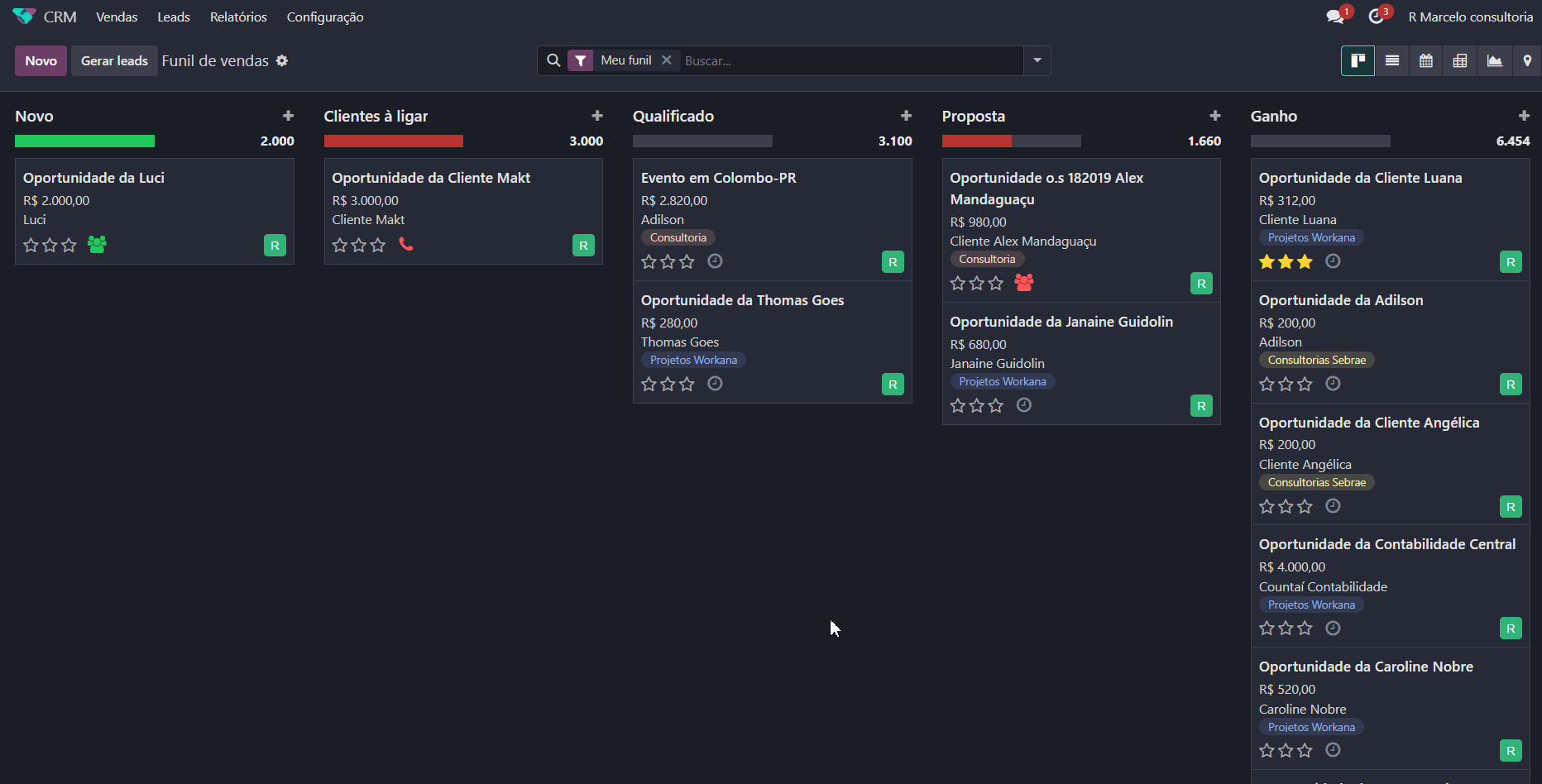 A visualização Kanban organiza as oportunidades por estágio. Arraste e solte-as no funil para movê-las de um estágio